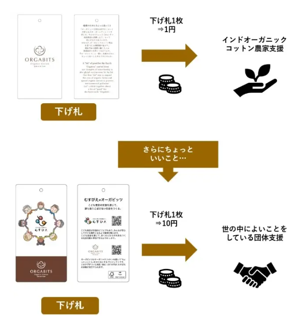 ORGABITSを使用した商品1点につき1円を、インドのコットン農家を支援する「一般財団法人 PEACE BY PEACE COTTON」に贈呈しています。 また、プロジェクトに参画いただいたブランドとのコラボレーション商品は、